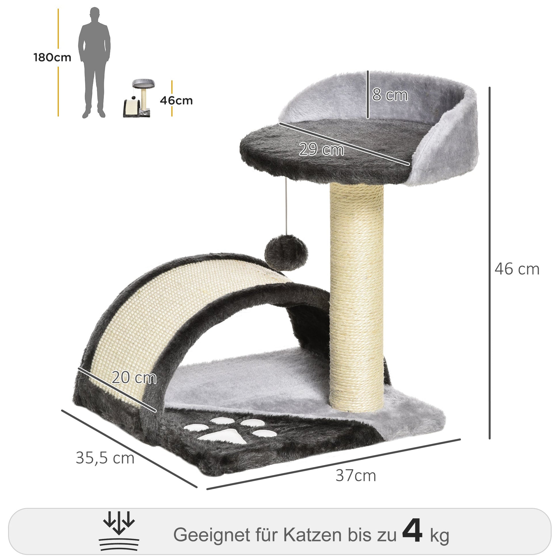 PawHut Kratzbaum 46 cm Kleiner Katzenturm mit Höhle, Spielball, Sisal-Seil, erhöhter Plattform, Katzenkratzbaum, Kletterbaum, für Katzen bis zu 4 kg, Dunkelgrau