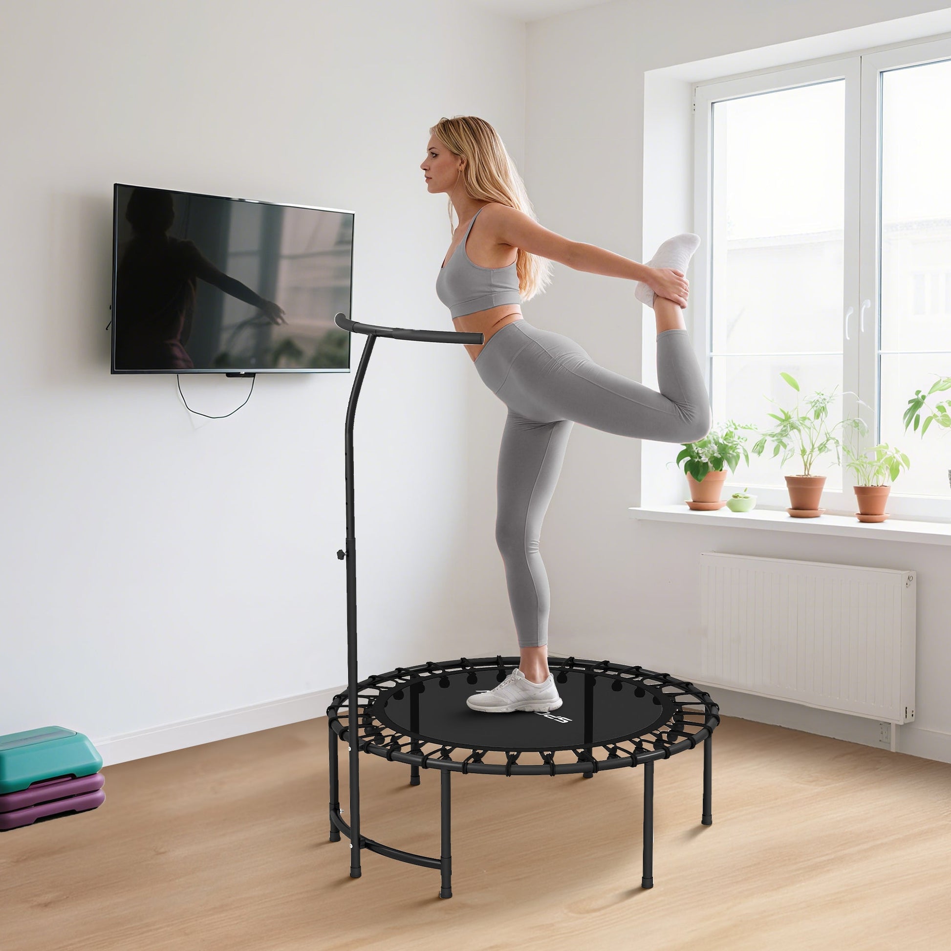 Tauchen Sie mit dem SPORTNOW Fitness Trampolin für Erwachsene in ein vergnügliches und gesundes Training ein. Dieses Fitness Trampolin, ideal für das Training des ganzen Körpers zu Hause, bietet 36 Bungees für ein ruhiges und gelenkschonendes Hüpfen sowie einen stabilen Stahlrahmen für bis zu 100 kg. Der höhenverstellbare T-förmige Griff des Trampolins gewährleistet Stabilität bei jedem Sprung und die rutschfesten Füße schützen Ihre Böden. Perfekt für Cardio, Gleichgewicht und Krafttraining.
